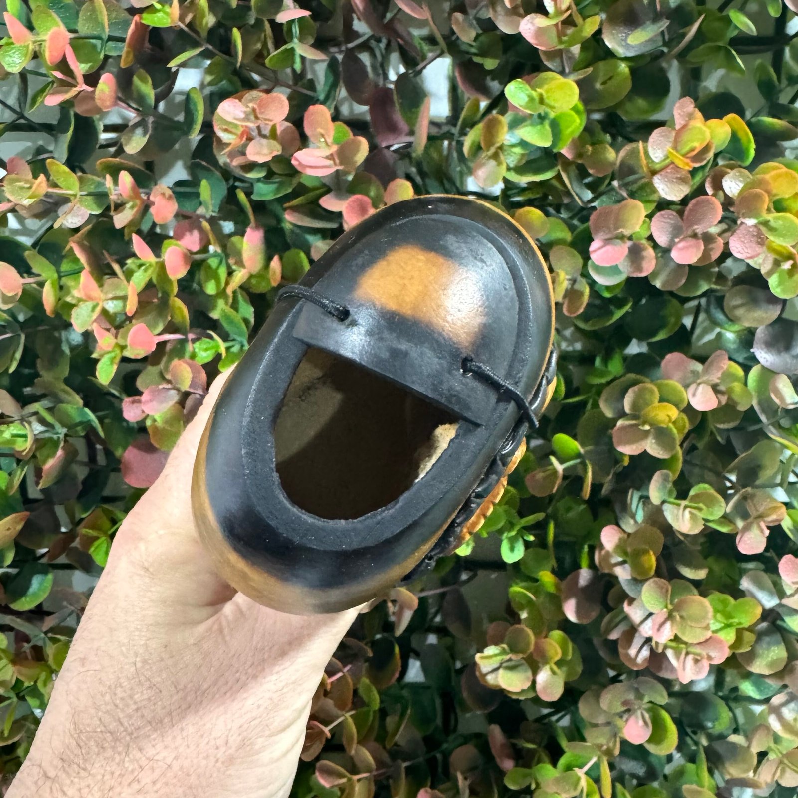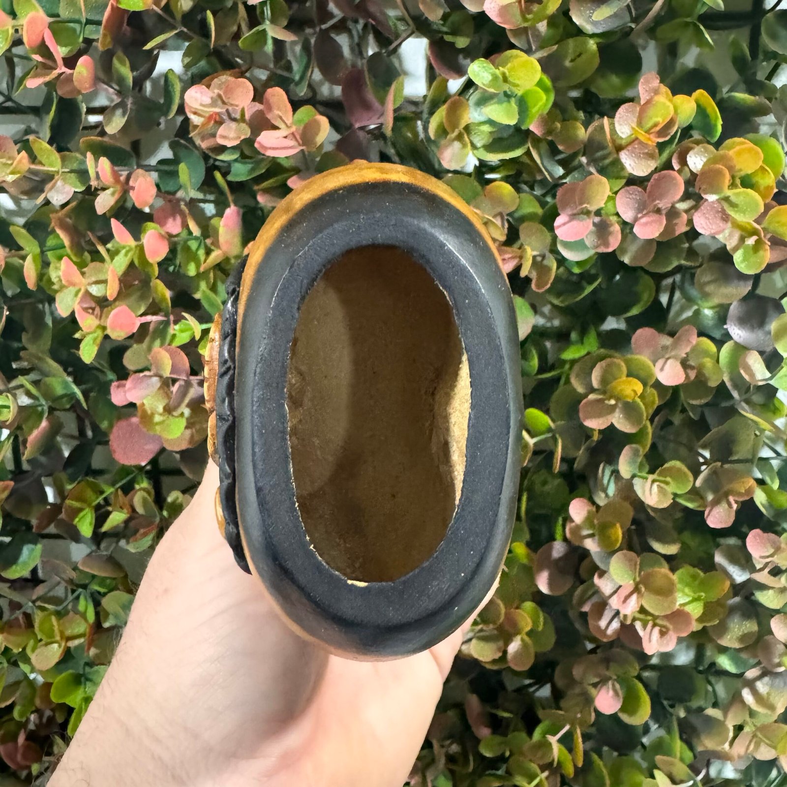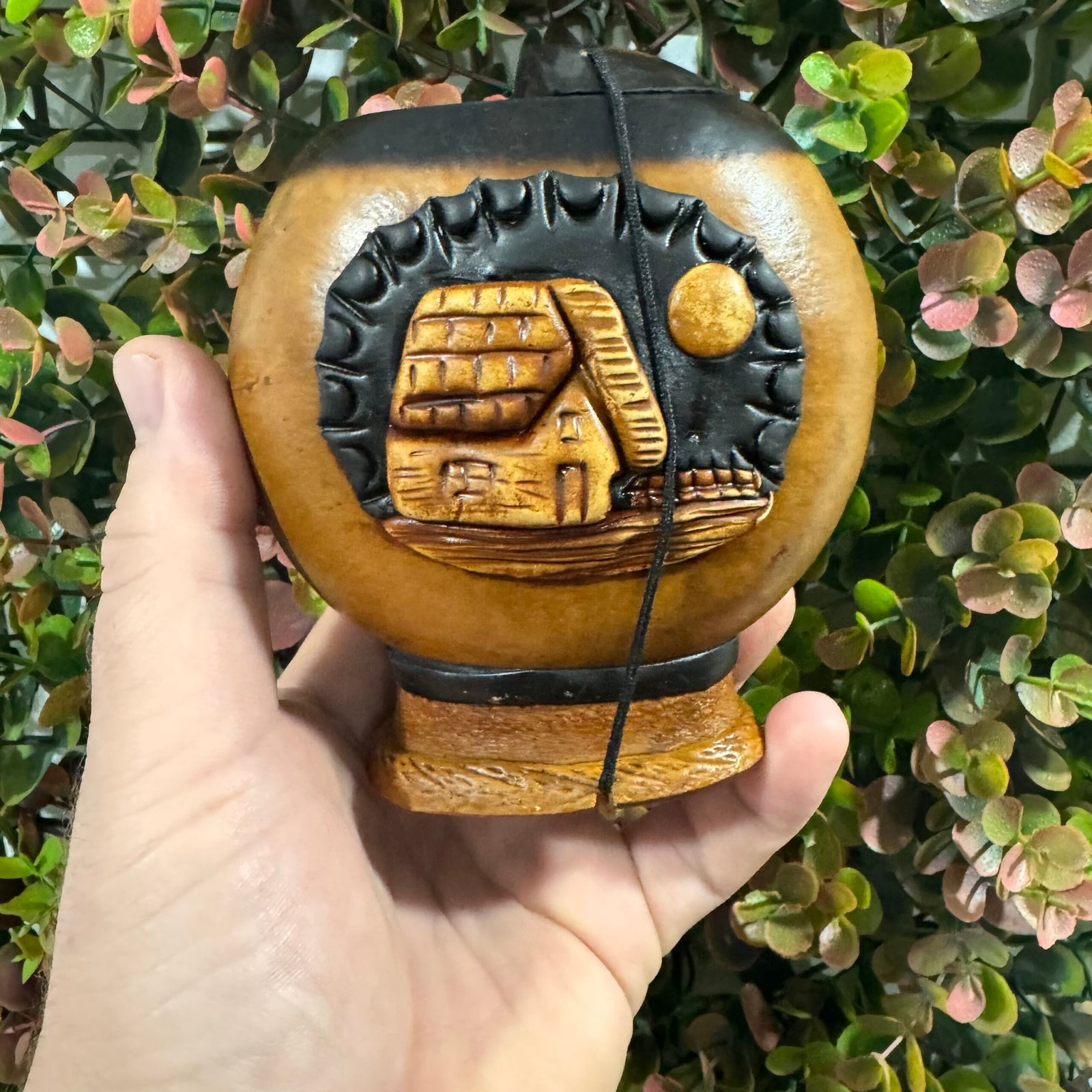 Cuia tipo gajeta uruguaia feita em porongo, com pé em resina e trabalho manual em resina, acompanha tapa mate.