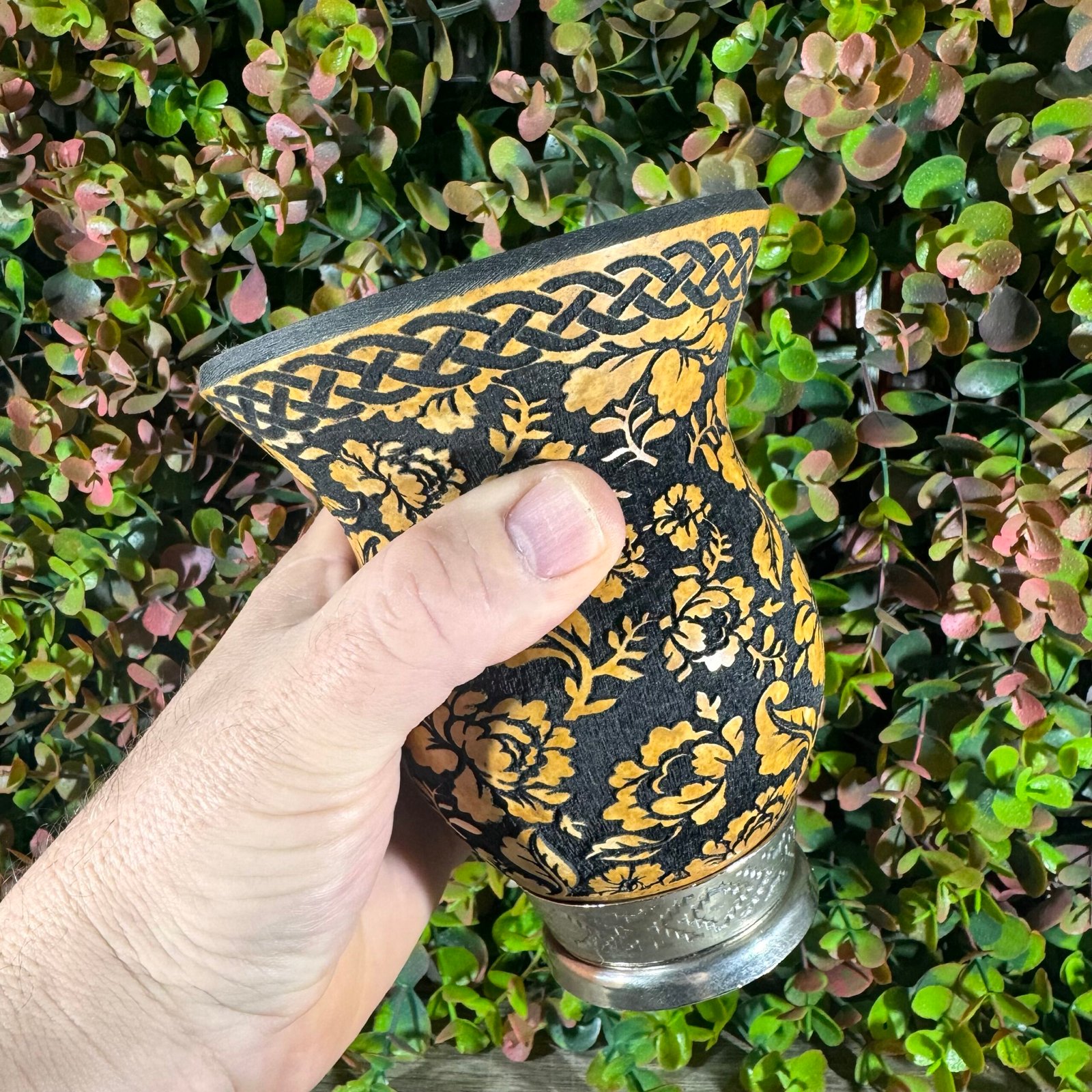 Cuia de porongo com gravação a laser 360º, com pé de ferro e bocal queimado.