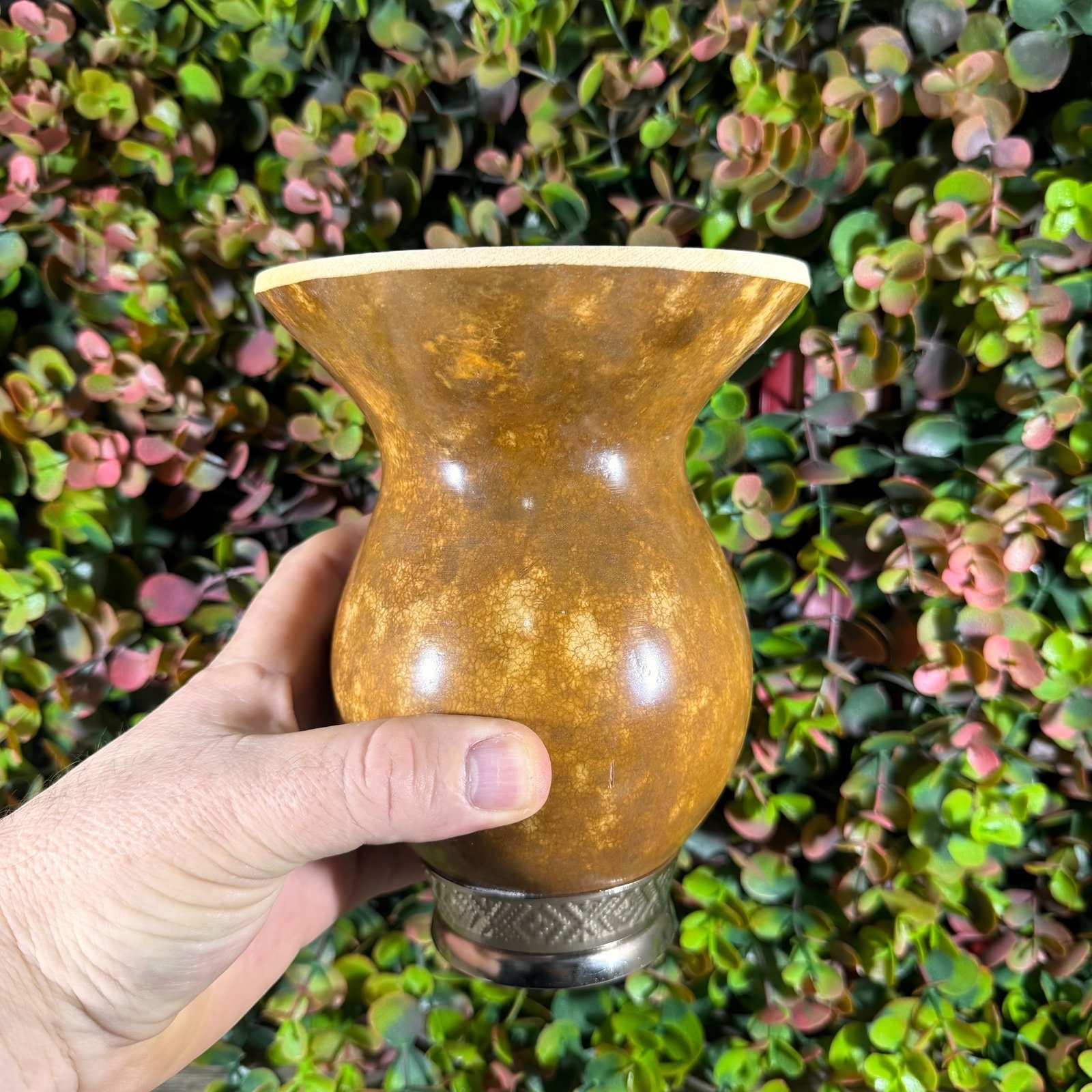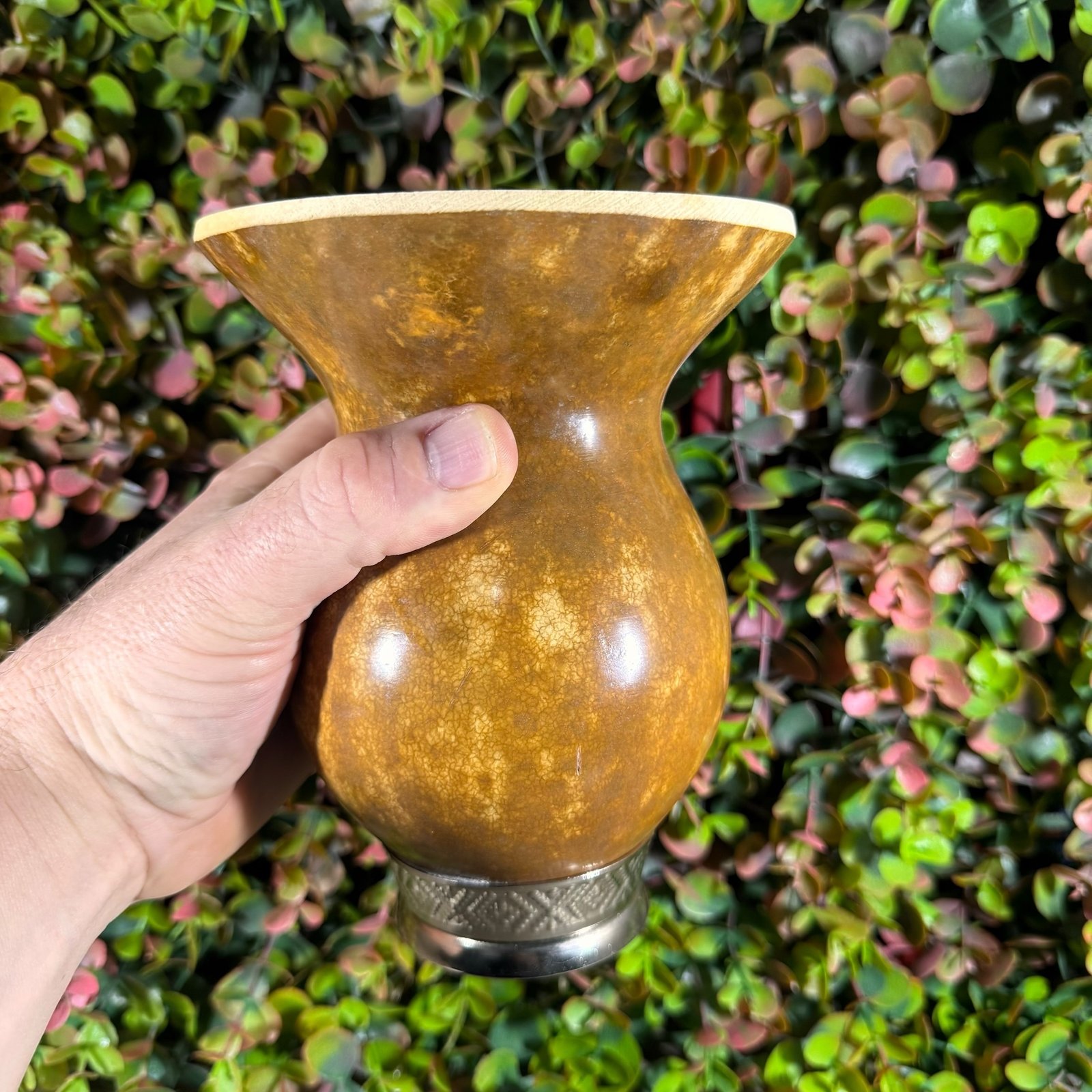 Cuia de porongo tradicional lisa, com pé de ferro e bocal quimado.