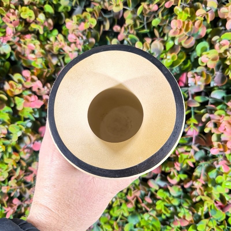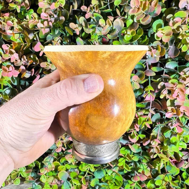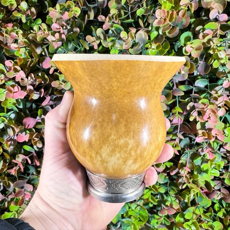 Cuia de porongo tradicional lisa, com pé de ferro e bocal quimado.